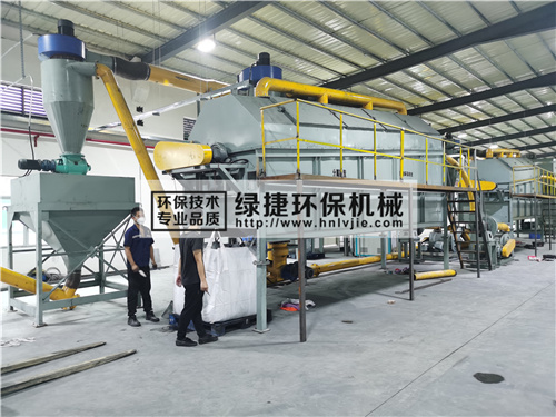 綠捷環(huán)保廢舊鋰電池處理設(shè)備案例現(xiàn)場鋰電池正極片粉碎脫粉設(shè)備環(huán)保型廢電池處置工藝流程,做到資源全部循環(huán)利用,該處理系統(tǒng)結(jié)構(gòu)設(shè)計(jì)合理,對鋰電池破碎徹底,回收的粉狀物質(zhì)純度較高,污染小,效率高,該處理工藝步驟簡單合理,處理過程環(huán)境污染小,回收率高,實(shí)用性強(qiáng)。廢舊鋰電池處理設(shè)備回收系統(tǒng)工藝包括撕碎機(jī)、破碎機(jī)、磁選機(jī)、粉碎機(jī)、分析機(jī)、分選裝置、分流閥、集料器Ⅰ、集料器Ⅱ、集料器Ⅲ、脈沖除塵器Ⅰ、脈沖除塵器Ⅱ、脈沖除塵器Ⅲ、高壓風(fēng)機(jī)Ⅰ、高壓風(fēng)機(jī)Ⅱ、高壓風(fēng)機(jī)Ⅲ、氣流分選機(jī)Ⅰ、氣流分選機(jī)Ⅱ、氣流分選機(jī)Ⅲ、引風(fēng)機(jī)Ⅰ和引風(fēng)機(jī)Ⅱ;所述撕碎機(jī)與破碎機(jī)、磁選機(jī)、粉碎機(jī)、分析機(jī)、分選裝置、分流閥、集料器Ⅰ、脈沖除塵器Ⅰ和高壓風(fēng)機(jī)Ⅱ依次連接。破碎機(jī)一輸出端連接有隔膜紙回收裝置,破碎機(jī)的第二輸出端連接有除塵裝置,破碎機(jī)的第三輸出端通過磁選輸送機(jī)連接有粉碎機(jī),粉碎機(jī)的輸出端連接有分類回收裝置,工作效率高,使用率高,分選處理效果好。